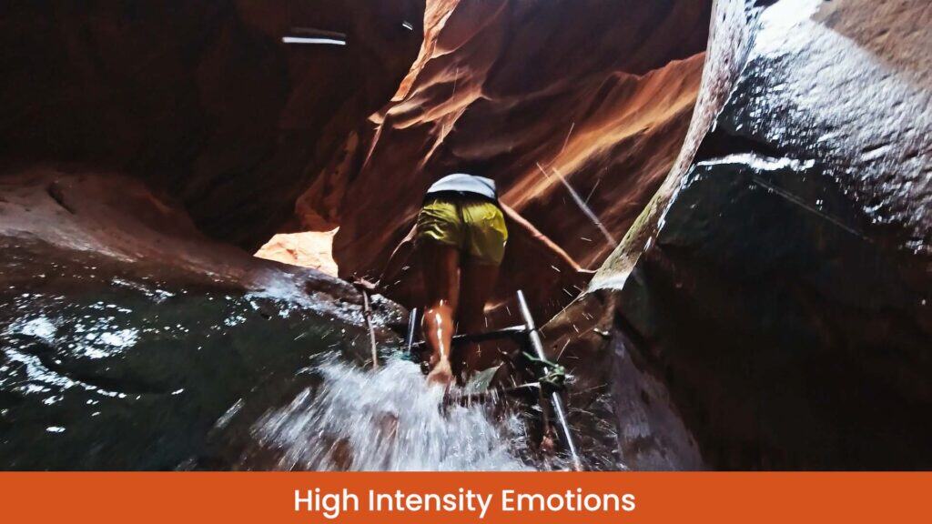 - For high intensity emotions, I’ve chosen a video of somebody climbing a ladder that is secured to rocks within a narrow space, but going up through a waterfall that’s crushing down on them.