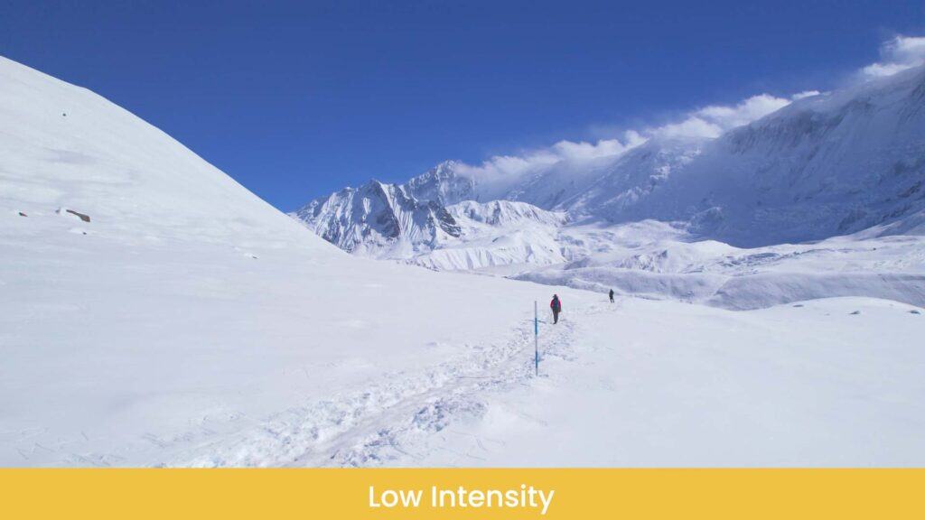 - For high intensity, I’ve chosen a group of hikers in the winter on very frozen land with no particular path, but just following one in front of the other.